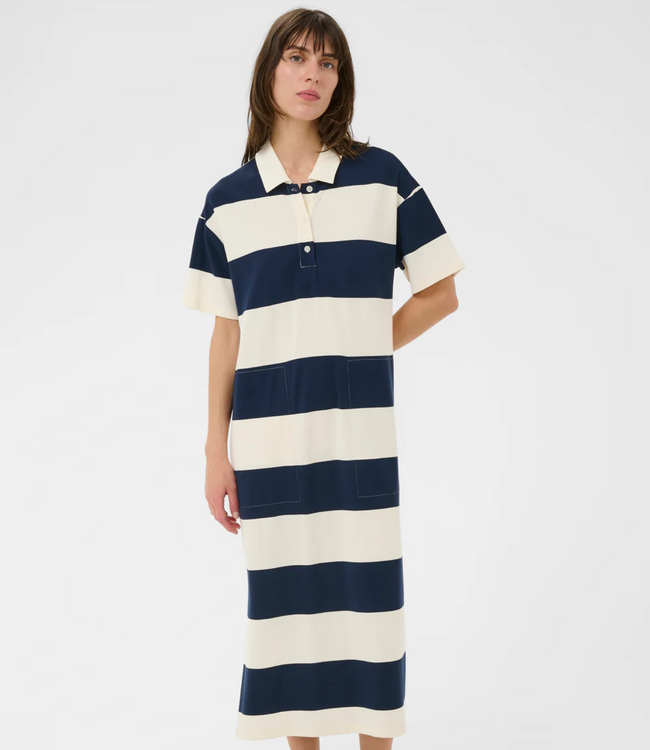 Robe t-shirt de style polo intemporelle de Part Two. Coupes décontractée. Rayures marine et crème. Poches latérales pour le côté pratique ! Lire plus.