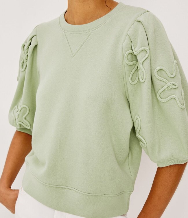 Ce pull à manches courtes ultra féminin est confectionné en molleton français ultra doux. Il est rehaussé de fleurs et de manches bouffantes.