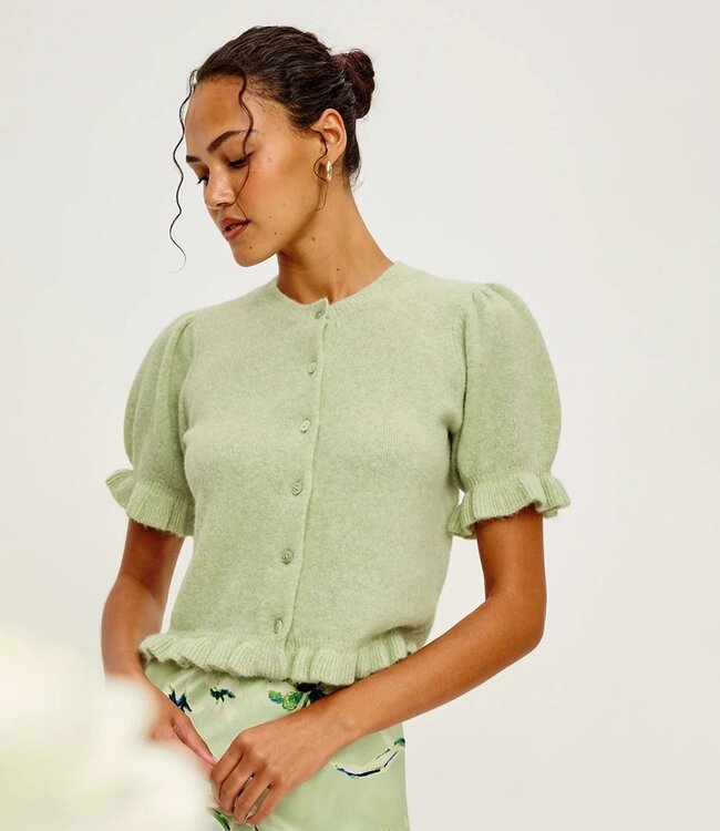 Confectionné dans un mélange de laine doux et chaleureux, le cardigan col rond Lora séduit avec ses boutons à l’avant, ses manches courtes bouffantes à volants et son ourlet délicatement festonné.