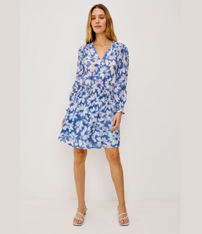 Robe courte en chiffon dotée de longues manches amples et vaporeuses avec jupe doublée, fermetures à boutons, détails smockés aux épaules, aux poignets et à la taille pour une silhouette subtilement définie.