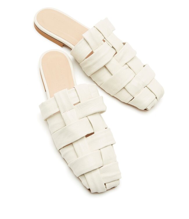 La sandale CARMEN de type mule de Sixter X Soeur sont en cuir tressé crème. Dotées d’un bout carré et d’un talon bas, elles sont conçues pour déambuler en ville avec style et confort.