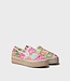 Cette espadrille fermée en tissu de coton présente un motif brodé multicolore. Elle est confectionnée en toile avec une semelle en jute de 3 cm de hauteur. Deux élastiques latéraux assurent un bon maintien du pied.